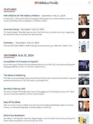 Publishers Weekly is the international news platform of book publishing and bookselling. Founded in 1872 and published continuously since then, the weekly magazine boasts more than 500,000 Twitter followers; publishes eight e-newsletters; monthly PW Select , three blogs; and a robust Web site that reached more than 8.5 million unique visitors last year. The magazine has also launched a mobile edition, digital editions and apps. Each year, Publishers Weekly reviews nearly 9,000 books, as well as e-books, apps and audiobooks, in addition to featuring author interviews and news and analysis about the world of publishing.