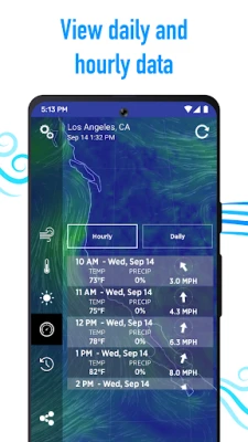 • See a 24-Hour Forecast as well as 7-Day Forecast showing: time, estimated temperature, estimated wind speed & direction, and what the chance of precipitation is